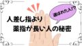 スピリチュアル 【選ばれた人!?】人差し指より薬指が長い人の秘密|本人執筆(画像あり) 人差し指より薬指が長い人には秘密がある。魂に刻まれた使命と前世からの契約。スピリチュアルな解釈だけでなく、科学的に説明される特徴は胎児期に浴びたテストステロンがカギ!女性で薬指が長い人は10人に1人。薬指が長い本人が執筆(画像あり) 2025.09.24 スピリチュアル